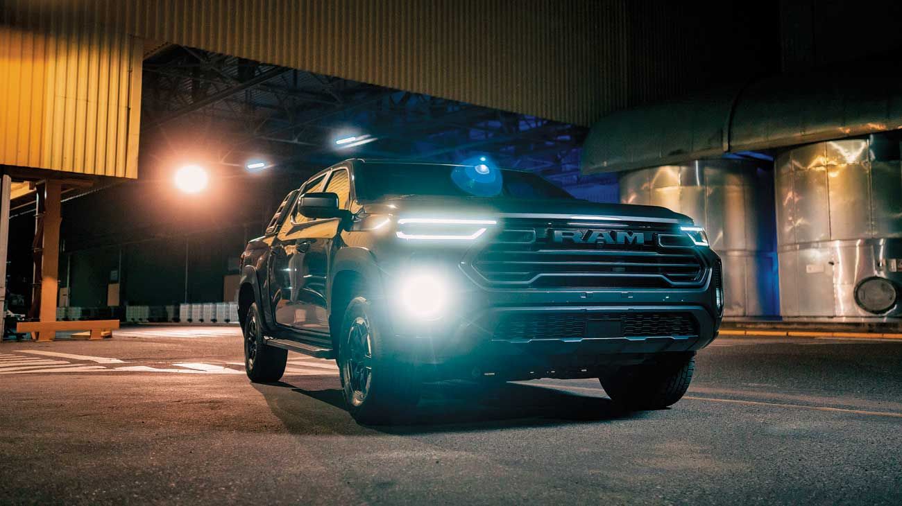 Desde el primer vistazo queda claro que su diseño pretende imponer presencia. La parrilla dominante con el nombre RAM en su centro, la firma lumínica LED extendida, el capó musculoso, los estribos laterales generosos y los guardabarros ensanchados dejan en claro que estamos ante un vehículo de carácter. Según la marca, su estética se desprende directamente del concepto Nightfall que anticipó esta pick-up.