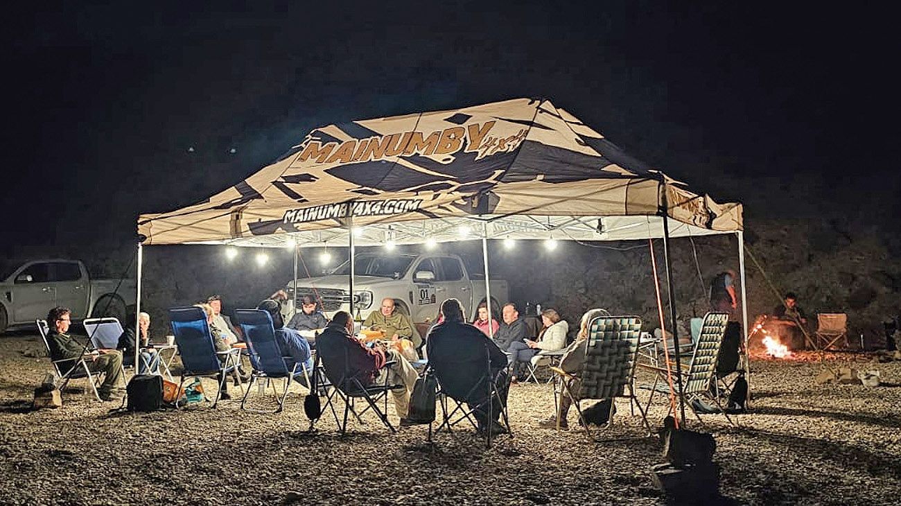Lo que siguió fue tan inolvidable como el paisaje, y no pasó por casualidad: fue el resultado de una logística fina. Once camionetas acampando en la soledad total, con carpas de apoyo Campinox para quien no tuviera equipo, asado a la llama como cena y –sí– electricidad en medio de la nada gracias a una estación de carga. Hubo heladera con freezer (hielo para las bebidas, helado de postre); y un completo set de higiene (obsequio de Mainumby4x4) para cada carpa. Como si el contraste fuera parte del plan, Wi-Fi satelital para todos: la civilización en tres barritas semicirculares de señal Starlink, mientras el silencio seguía mandando y el fogón se reflejaba en la quietud del agua. No faltó quien, tentado por la noche limpia, se llevó la bolsa de dormir a la orilla para descansar a cielo abierto bajo una obscena cantidad de estrellas.