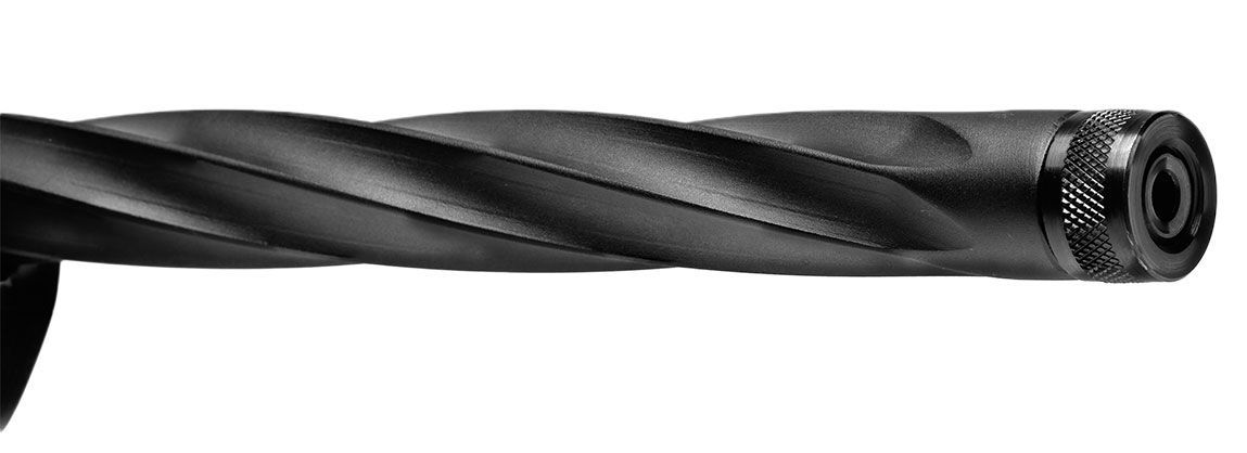 El cañón presenta un marcado perfil pesado y un espiralado profundo, lo que permite una excelente disipación del calor, ideal para sesiones de tiro prolongadas, a la vez que le confiere un aspecto estético reconocible. Esto contribuye a un balance adecuado y minimiza la distorsión térmica. Su longitud es de 457 mm (es carabina para nuestra legislación) y cuenta con una rosca de 1/2” x 28 mm en su extremo anterior. Esta configuración heavy barrel incrementa la precisión en cualquier especialidad de tiro.