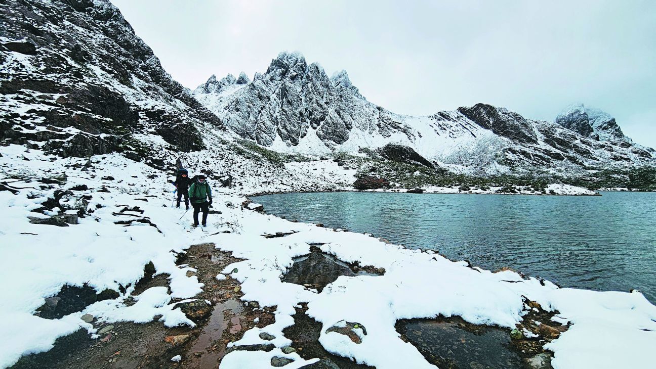 El día 2 se inicia temprano, en compañía de lagunas, salpicadas en el paisaje como manchas verdes y turquesa, compensando la inestabilidad del clima, el gran rival a vencer. No por anunciados, el viento y la nieve son menos crueles. En pocos minutos un cielo de acero irrumpe con ese efecto seguido de lluvia, ocultando la panorámica del canal Beagle y complicando la ladera del Bandera, un peñasco nada fácil. Se supone que desde aquí debieran verse a lo lejos los dientes de Navarino, pero no es el caso.
