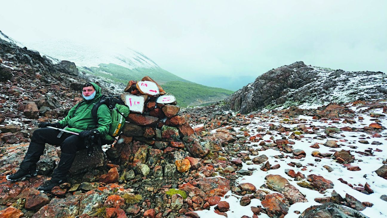 Algo abrumados enfilamos a los pasos, un conjunto de portezuelos que ofician de postas. El Paso Primero, ya a 716 m de altitud, dibuja un sendero hacia el Paso Australia (797 m), rodeados ya por las montañas de Navarino. Estamos circunvalando los dientes, pero, al pasar por el abra más baja y la aguja más alta de esos picos, se genera la sensación de estar debajo de un volcán de El Señor de los Anillos. Lo que viene, si el cielo está abierto como en nuestro caso, no es menor: el mar, el lago Windhond, la bahía y las islas Wollaston, donde se encuentra el Cabo de Hornos. Allí se avanza lento hasta el tercer paso, el de Los Dientes (765 m), destino del campamento. “Tenemos suerte de que el clima nos permita estar aquí”, reitera el guía y sólo 10 minutos después debemos campear un chaparrón, escondidos tras una roca donde nuestra carpa amarilla brilla en un horizonte blanco.