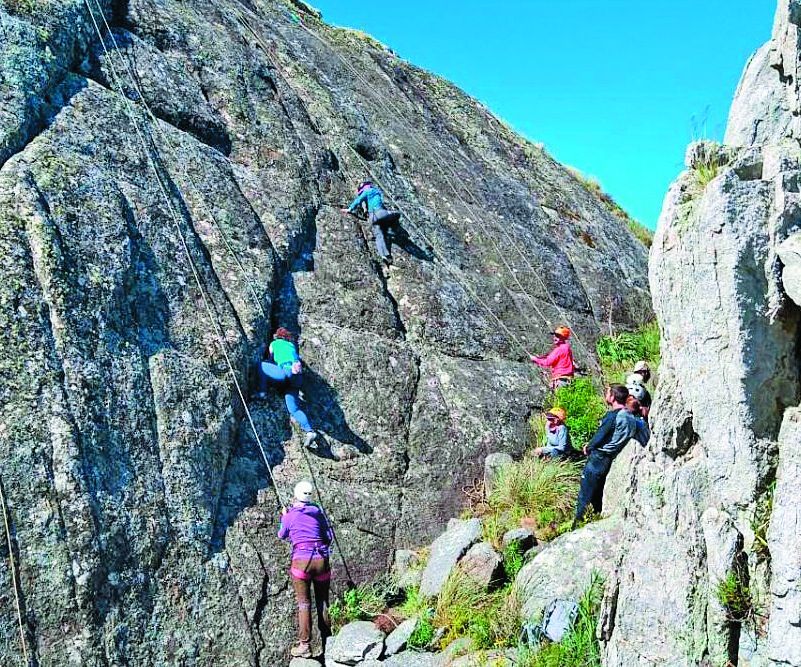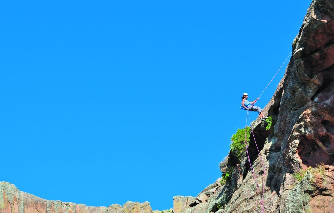 Hecha la experiencia en la palestra, salimos a la Ruta 34 que atraviesa las Altas Cumbres con algunos datos clave. A 20 km de El Cóndor, cuando el trazado gira bruscamente al sur, un paraje sabe de secretos. Ahí está el puesto de la familia González, nutrido de regionales, cueros y buenos mates. Ese es el punto de partida hacia La Ola, la enorme piedra redondeada que emerge para deleite del escalador. Aquí se han colado varios accesos sobre una de sus caras, formando una perfecta palestra natural con unas 150 vías con trabas y seguros para ascenso y descenso. Nuestro guía abre el bolso y saca cuerdas enrolladas de distintos milímetros, mosquetones, salvacaídas, ochos, arneses, anclajes y otros elementos. Se carga de ellos y la encara. Lo seguimos, y de a poco, también gracias a las clases previas, comenzamos a imitarlo en una zona inclinada con buenos agarres de pies y manos. Lo mejor para nosotros llega a media altura, cuando el líder dice basta y es momento del rappel de descenso. Repetimos la escena un par de veces hasta que los brazos ya no quieren más, y luego nos remitimos a aprender, viendo al guía deslizarse sobre vías difíciles, grietas horizontales y agarres de maniobras complejas.