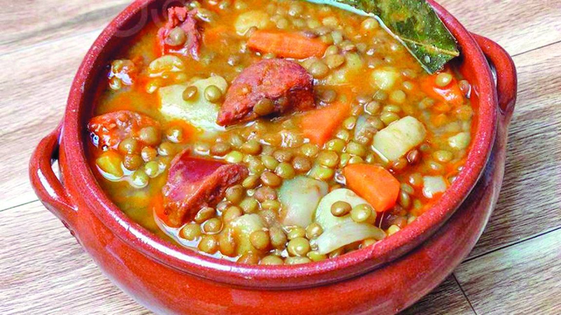 Es una comida completa que combina legumbres, verduras y carnes en una sola cocción. Se inicia con un sofrito de cebolla, ajo, pimiento y tomate, que forma la base aromática del guiso. Las lentejas, remojadas previamente, se incorporan a esta base junto con chorizo, panceta y, en algunas versiones, carne de ternera o cerdo, que se cocina lentamente hasta que todo esté tierno y los sabores bien amalgamados.