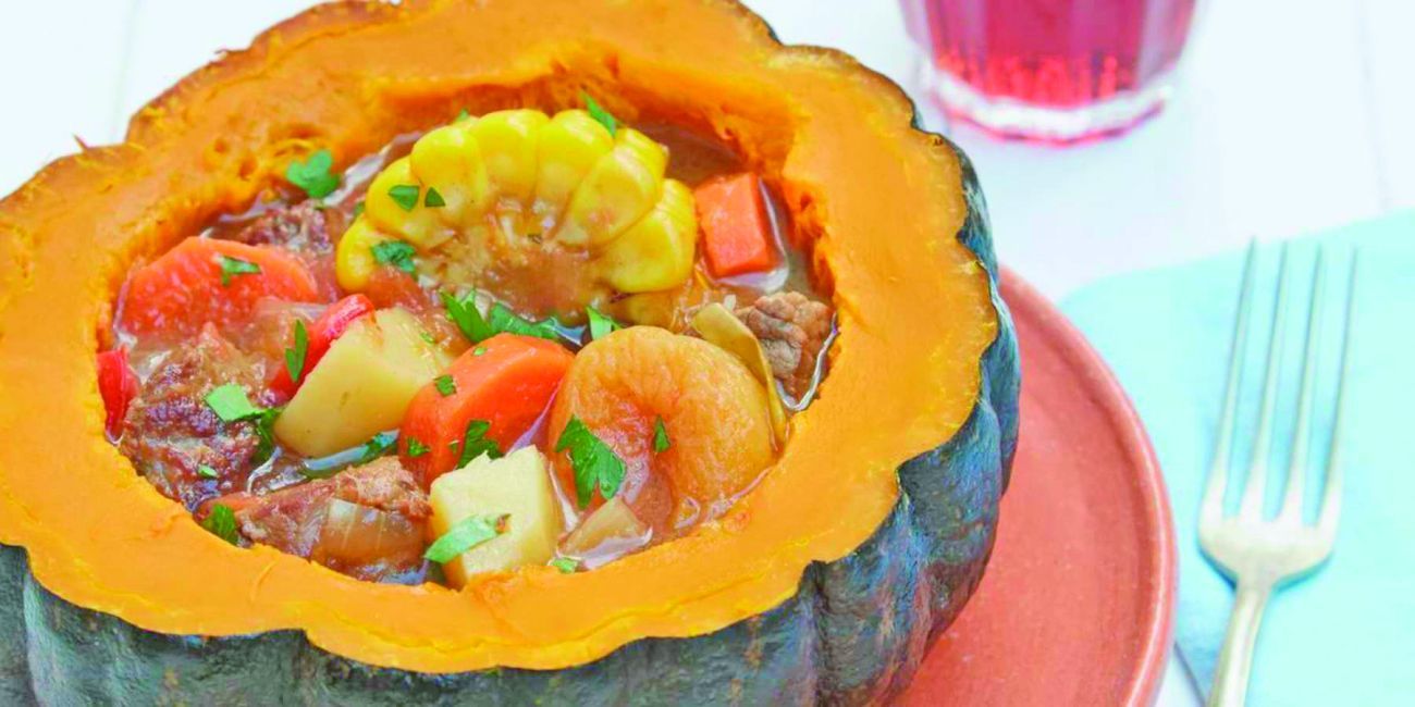 Para seis porciones, por ejemplo, lleva 2 kg de carne (cualquier corte sin venas ni grasa), 300 cc de tomate triturado, 2 cebollas, 2 pimientos rojos y 2 verdes, 2 kg de zapallo plomo, 200 g. de papas, 200 g de batatas, 3 choclos cortados en rodajas o desgranado, 1 cucharadita de ají molido, 1 cubo de caldo de carne, 100 cc de vino tinto y sal y pimienta a gusto.