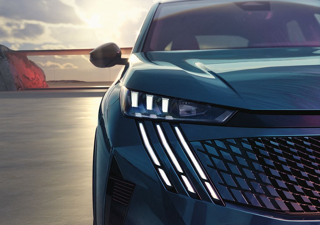 Presenta un diseño aerodinámico y moderno, destacándose por su silueta. La vivacidad de las líneas felinas se debe a las equilibradas dimensiones del vehículo (largo: 4,54 m, ancho: 1,89 m, altura: 1,64 m), al tiempo que ofrece un amplio espacio para pasajeros y equipaje. En su interior, incorpora el innovador el Peugeot Panoramic i-Cockpit provisto de una pantalla curva de 21 pulgadas que combina con el cuadro de instrumentos digital y la pantalla central táctil, brindando una experiencia de conducción envolvente y tecnológica.