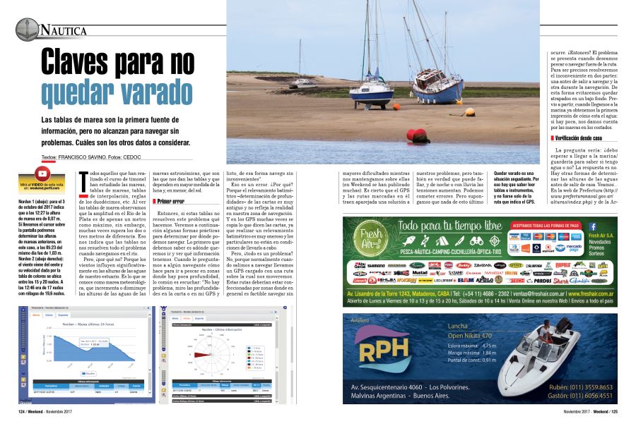 Pero, ¿todo es un problema? No, porque normalmente cuando salimos a navegar llevamos un GPS cargado con una ruta sobre la cual nos moveremos. Estas rutas deberían estar confeccionadas por zonas donde en general es factible navegar sin mayores dificultades mientras nos mantengamos sobre ellas (en Weekend se han publicado muchas). Es cierto que el GPS y las rutas marcadas en él traen aparejada una solución a nuestros problemas, pero también es verdad que puede fallar, y de noche o con lluvia las tensiones aumentan. Podemos cometer errores. Pero supongamos que nada de esto último ocurre. ¿Entonces? El problema se presenta cuando deseamos pescar o navegar fuera de la ruta. Para ser precisos resolveremos el inconveniente en dos partes: una antes de salir a navegar y la otra durante la navegación. De esta forma evitaremos quedar atrapados en un bajo fondo. Previo a partir, cuando llegamos a la marina ya obtenemos la primera impresión de cómo esta el agua: si hay poca, nos damos cuenta por las marcas en los costados.