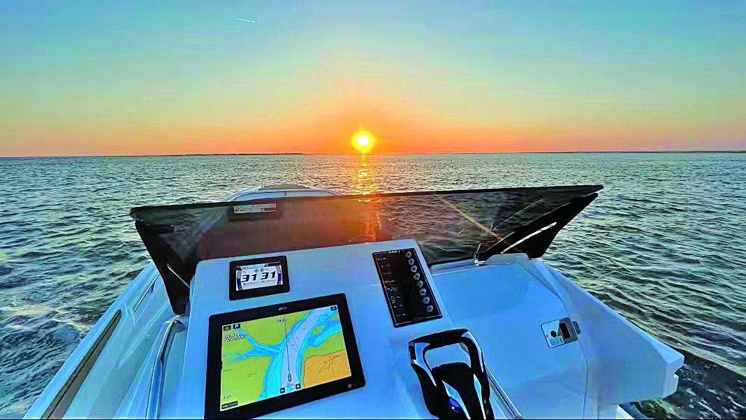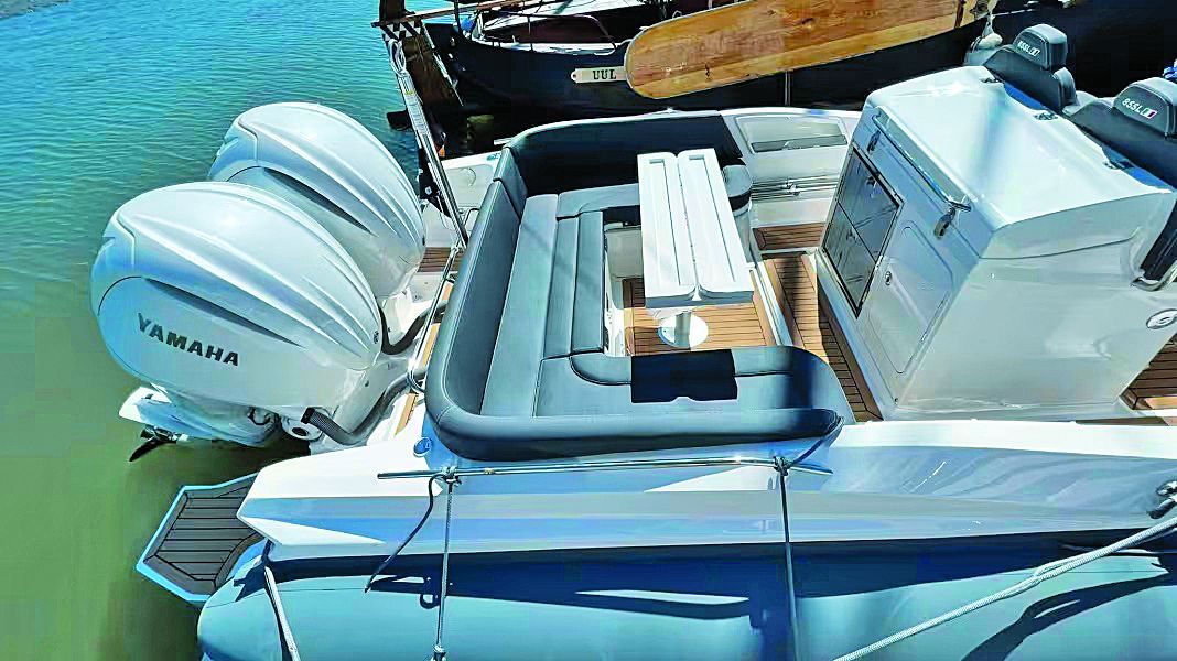 El acceso desde la popa transmite seguridad gracias a su buena estabilidad lateral. Los asientos del timonel y acompañante —con almohadones rebatibles, posapiés y manijas firmes— suman comodidad y soporte. El modelo de prueba equipaba dos fuerabordas Yamaha de 250 HP, con mando electrónico drive-by-wire y dirección steer-by-wire. El manejo resultó suave y preciso, complementado por una pantalla Yamaha y un kit de navegación Raymarine opcional.