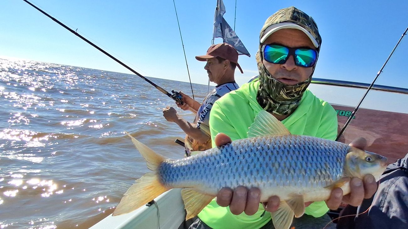 Aprovechando una buena marea en las últimas dos horas de la bajante, nos atamos a los palos y practicamos la pesca de bogas empleando equipos de pesca muy livianos con cañas de 10/15 libras (1 libra: 450 g). Acompañamos con pequeños reeles rotativos del tipo huevito o frontales, aparejo de dos anzuelos bogueros número 2 y plomo de 60 gramos del tipo palito que se engancha menos. Rápidamente hubo respuestas de bogas que picaban en nuestras carnadas. Rindió el maíz remojado en vainillín, con la clave de solo poner uno o dos maíces para no perder tanto pique. También rindieron los daditos de salamín y la masa dulce con esencia de vainilla. Todos los encarnes en anzuelos tipo Maruseigo número 14. En tan solo 4 horas de pesca, obtuvimos varios ejemplares de bogas medianas lo que significa que estamos en presencia de una muy buena temporada de esta especie. Con el mismo maíz, también obtuvimos varios bagres blancos muy grandes.
