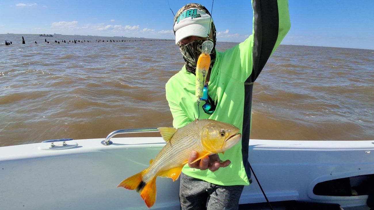 A medida que cambió la marea y se afirmó la bajante, cambiamos los equipos por cañas más potentes de 15 a 25 libras y las líneas de fondo por los señuelos. Con esa artillería fuimos en busca de dorados cruzando el malecón al sur. En lo personal, elegí una mojarra BNV color blanco y rojo de paleta número 2 para realizar los lances entre los palos y traer rápidamente rozando el fondo. El señuelo posee la particularidad de tener anzuelos simples para evitar los enganches. Pudimos obtener un dorado y otro que se liberó en el potente segundo salto. Además mientras estuvimos pescando bogas tuvimos tres piques de dorados que comieron el maíz. Esto sirve como referencia para saber que las especies de verano ya están en estas aguas, y , sin dudas, Berisso merece una visita para ir por bogas y dorados, una pesca que hará estremecer las chicharras de los reeles.