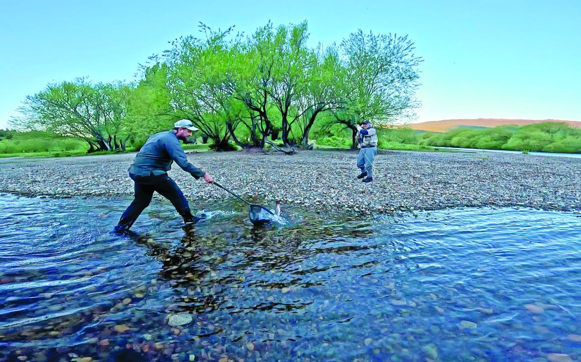 El río Corcovado fue nuestro segundo destino, donde contamos con el apoyo del guía Jeremías Villada y del auxiliar Leonardo Torres, dos buenos conocedores del cauce que, además de la pesca, entienden del rafting. Bien necesario saber de esto ya que el Corcovado es un río de montaña rápido, y que hay que saber por dónde y cómo trasponer sus aguas blancas con seguridad. El cauce corre entre encajonados cañadones, chocando corrientes y desordenándose. Alterna rápidos con sectores de aguas mansas y pozones. Un río truchero con todos los condimentos para encontrar infinidad de pesqueros donde poner una mosca. Con el beneficio adicional de que, por su estructura intrincada, deja poco margen para la depredación y la sobrepesca furtiva de orilla, eso hace que tenga truchas en buena cantidad y aceptable calidad para la pesca deportiva desde balsas. Como en todos los ambientes de Chubut, los anzuelos deben ser sin rebaba. Si la trae, hay que aplastarla bien con una pinza o un forceps.