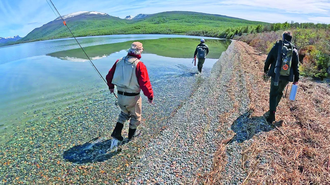 Las fontinalis suelen alimentarse mayormente en profundidad, lo que impone usar varas de potencia #6 o #7, con líneas de hundimiento de 250 grains y tippet de entre 2X a 0X. La estrategia de pesca consiste en lanzar desde dentro del lago y hacia la costa, en caso de contar con embarcación o belly boat. En nuestro caso la pesca fue enteramente al vadeo, por lo que los lances los fuimos a haciendo hacia adentro del espejo. Buscando la hondura de algún drop off o veril, como también recorriendo por el flat vadeando paralelo a la costa, casteando tanto hacia adentro como hacia los lados. La profundidad no es excesiva en la margen oriental donde estábamos, pero tiene sobre la terminación de la playa unas grandes piedras bocha, donde puede estar refugiada y al acecho una de las grandes. En los lugares que se percibe una mayor profundidad conviene lanzar lo más lejos posible, dejar profundizar un poco y empezar a estripear buscando el ritmo y la cadencia óptima. A veces un estripeo lento y con tirones largos funciona mejor que uno muy rápido. Es cuestión de ir cambiando tanto moscas como cadencias y formas de recuperación, buscando dar con lo que funciona.