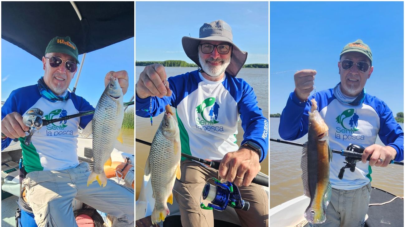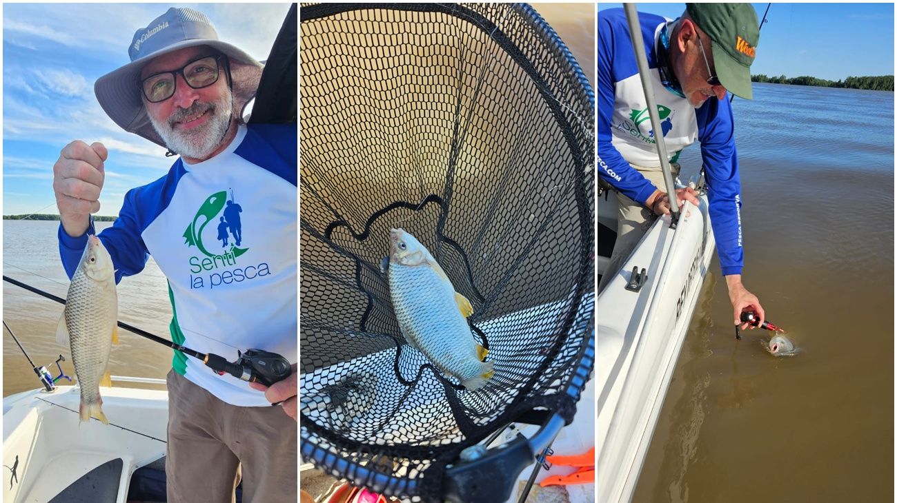 A las ocho de la mañana ya estábamos sobre el agua. La idea inicial era trabajar la costa bonaerense, buscando bogas en profundidades de 15 m. Pero la combinación de viento cruzado y la fuerte bajante del río complicaron el fondeo desde el primer minuto. Para ganar estabilidad, decidimos acercarnos más a la costa y trabajar en los 7 m, armando dos cañas con postas de sábalo para variada y dejando otras dos en mano con líneas de un solo anzuelo para la boga. Fuimos alternando carnadas, desde daditos de salamín, maíz hasta dados de sábalo y, aunque los piques fueron muchos, las respuestas firmes fueron pocas. Sólo un par de bogas rondando los 2 kilos, lindas y muy luchadoras para arrancar la jornada.