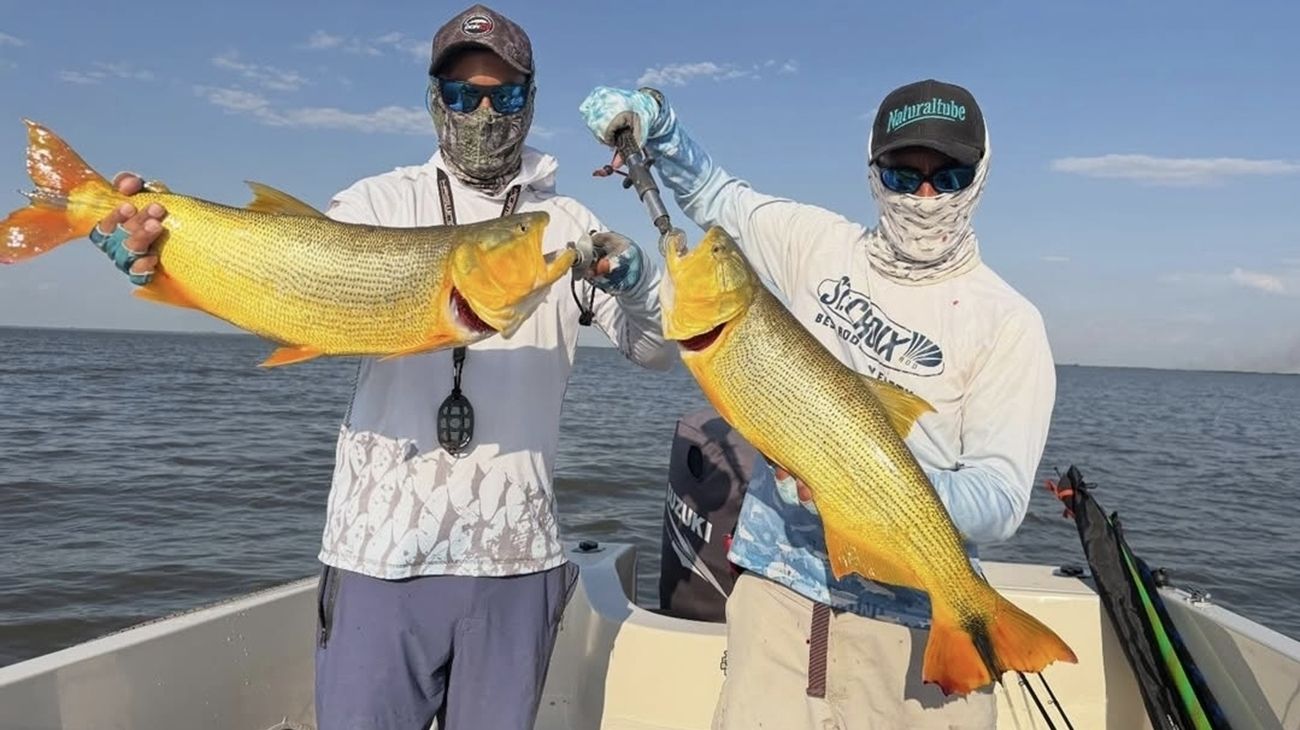 Posteriormente, nos dirigimos a los bancos de arena cercanos al río Negro. Allí la pesca se presentó algo más irregular, pero con peces de muy buen tamaño, lo que justificó ampliamente la recorrida. Más tarde, al realizar pesca costera, fuimos testigos de un espectáculo natural único: grandes cardúmenes de sábalos desplazándose en aguas claras, una postal típica del litoral. Retomando la navegación hacia el sur, trabajamos canaletas y bancos, donde nuevamente dimos con dorados muy activos y combativos. La regularidad en los piques y la calidad de los ejemplares terminaron de consolidar una jornada sencillamente espectacular.