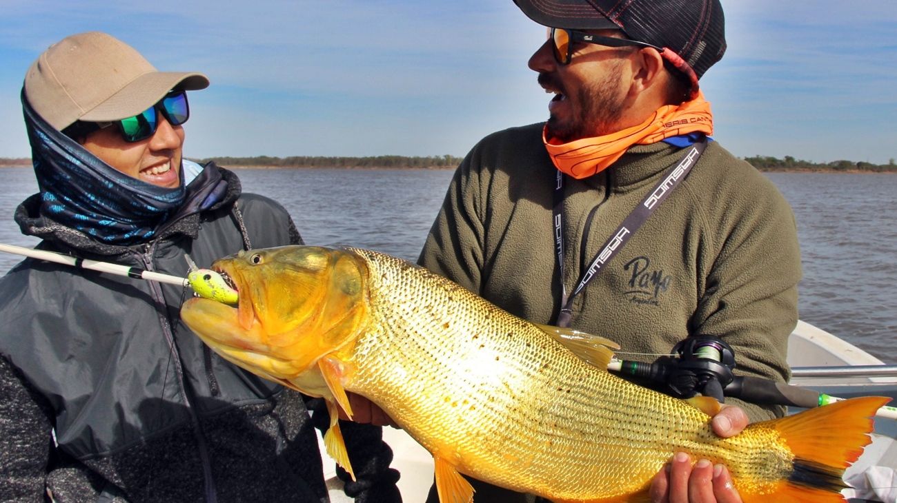 La jornada comenzó puntualmente a las 8, con unos 10 °C de mínima para darnos los primeros puntos de tiro en las maravillosas costas ubicadas apenas a unos minutos de navegación. El ejercicio es provocar a los dorados que acechan a mojarras y sabalitos. La técnica es lanzando los señuelos de forma precisa en los remansos que producen los árboles sumergidos y detrás de las piedras, algo que por las costumbres de este pez se da en las primeras o últimas horas del día, aunque cuando está plena actividad esta regla no es absoluta.