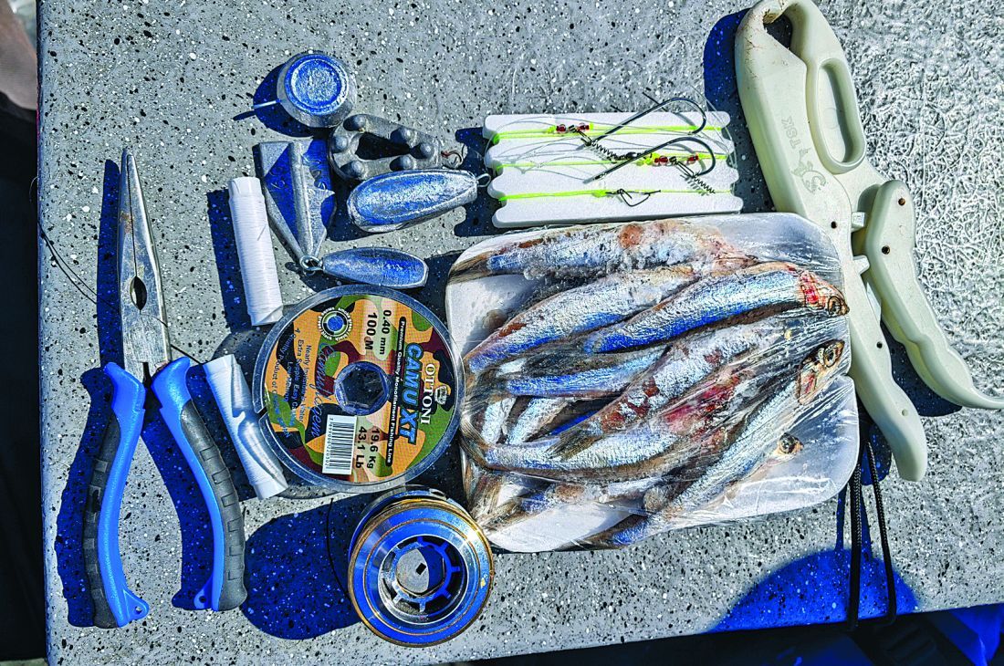 Con la correntada en su punto, anclamos para quedar bien posicionados. Las líneas tocaron el agua enseguida: la mayoría de los equipos ya estaban listos, con cañas de variada de 6 a 8 pies, acción media; reeles frontales o rotativos cargados con monofilamento 0,40–0,45 mm o multifilamento 40–45 lb (1 lb = 0.453 kg). La línea es tan simple como efectiva: plomo pasante sobre el nylon del reel (o sobre una madre de 1 m en 0,50 mm), esmerillón y brazolada de 1 m con anzuelo de abertura mínima 28–30 mm.