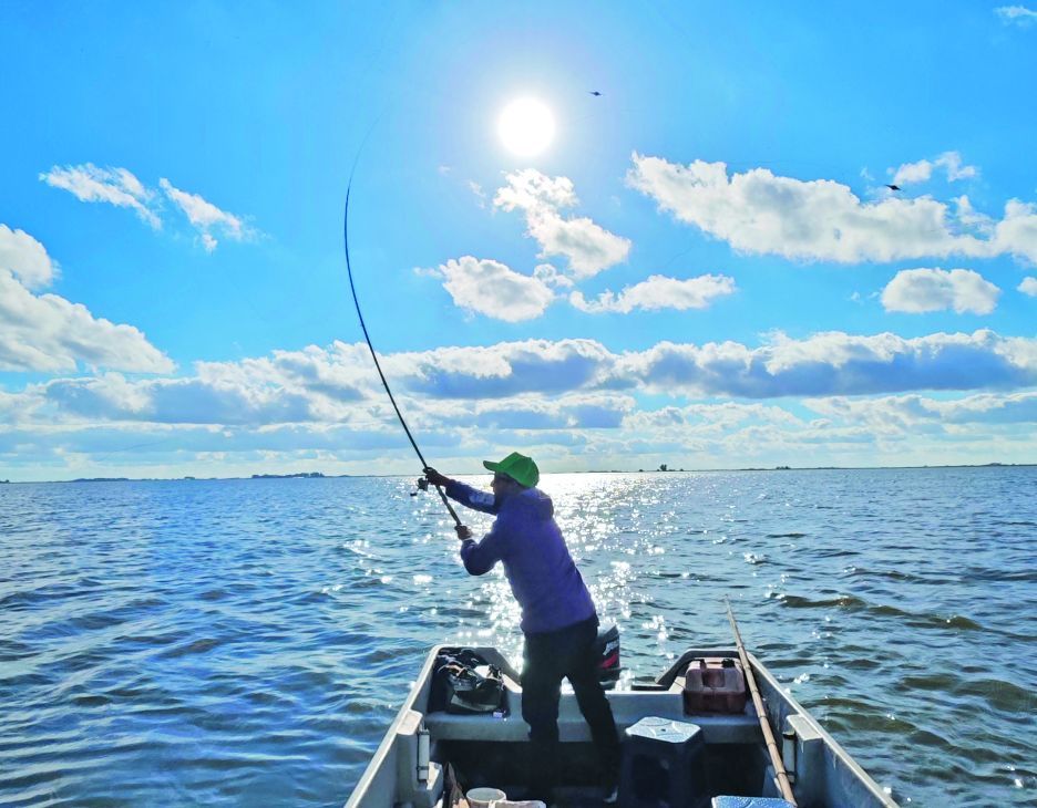 Al mediodía ya llevábamos más de una docena de ejemplares, todos de excelente porte, por encima de los 40 cm. La seguidilla fue constante. Antes de la tarde, ya nos sentíamos realizados, pero decidimos intentar en una costa profunda de pastos, en busca de algún matungo estacionado. Almorzamos a bordo, sin dejar de pescar, anclados en el centro de la laguna. Cambiamos aparejos y bajamos las brazoladas a 1,60 m.