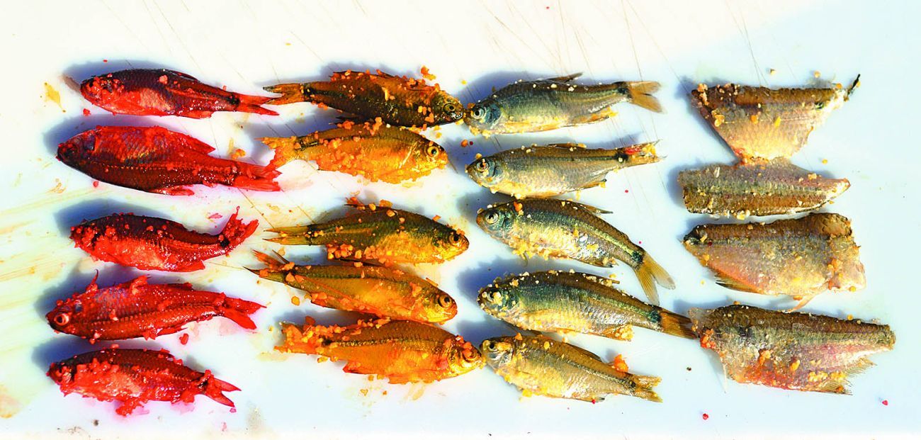 Otro aparejo que rindió muy bien fue el tradicional paternóster, con tres anzuelos y un plomito al final. En ambos sistemas empleamos anzuelos N° 1/0. En cuanto a los engaños, fueron variados: mojarras vivas, filete de dientudo, mojarras saladas, enharinadas en maíz y también filete de magrú. Además, sumamos carnadas teñidas en rojo, verde y amarillo, que resultaron atractivas.