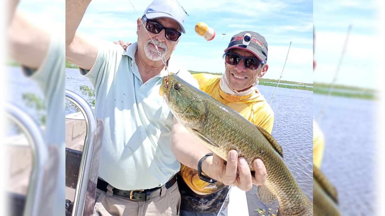 María Luz Villagra, directora de Turismo de Pueblo Belgrano nos invitó a visitar este pintoresco destino, y nos adentramos en las aguas del Uruguay en una salida que fue guiada por Raúl Almeida, un referente local no solo por su conocimiento del río sino también por su compromiso ambiental. Raúl integra la Asamblea Ambiental y el Foro Gualeguaychú, forma parte de la Fundación Azara y es responsable del Museo de Ciencias Naturales Manuel Almeida, lo que se refleja en su enfoque responsable de la pesca. Tras una breve navegación, hicimos la primera parada en la boca del Gualeguaychú y el Uruguay para buscar pesca variada. Algunos bagres amarillos serían destinados como carnada para dorados. Durante el trayecto, y con la embarcación en movimiento, pinchamos el primer dorado de la jornada, anticipando la buena actividad que nos esperaba.