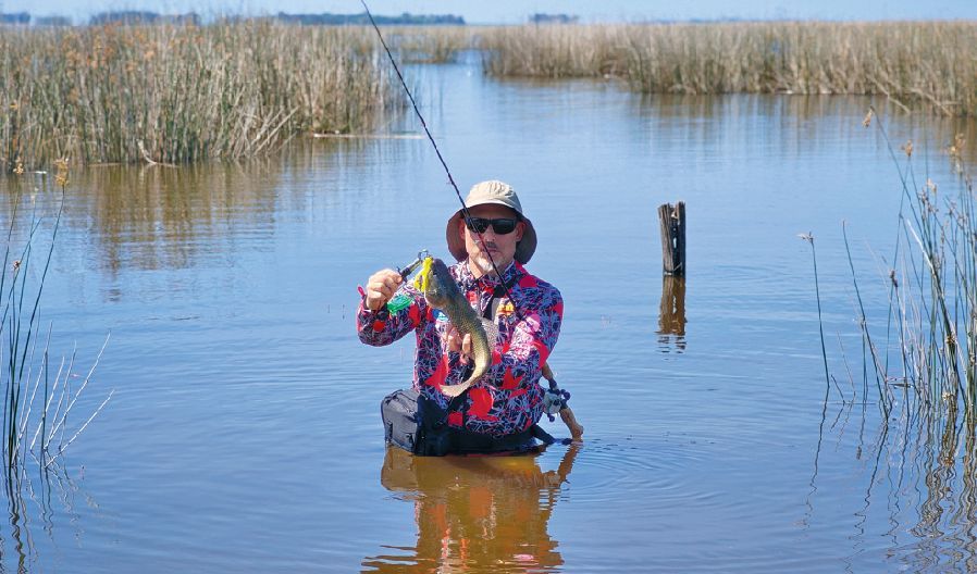 Dejamos de lado el sector tradicional y nos internamos hacia los bañados. La mañana estaba tibia, con un sol que apenas se filtraba entre las nubes. A cada paso, el barro se pegaba a las botas como si quisiera retenernos. El aire olía a verde y a promesa. Las primeras pruebas con artificiales no fueron alentadoras. Veíamos actividad, pero las tarariras no tomaban con firmeza. Algún toque aislado, una captura solitaria y mucho misterio. Cambiamos de estrategia: filete de dientudo, carnada fresca. Entonces el paisaje se transformó. A lo lejos, el agua comenzó a vibrar. No era el viento. Eran ellas. En cada charco, en cada recodo del campo inundado, la superficie bullía. Decidimos avanzar un kilómetro más, hasta llegar a un lugar impensado: un desborde reciente, de apenas 10 cm de profundidad, cubierto de pastos y pececitos que corrían despavoridos. Detrás de ellos, las sombras. Tarariras grandes acechando en silencio.