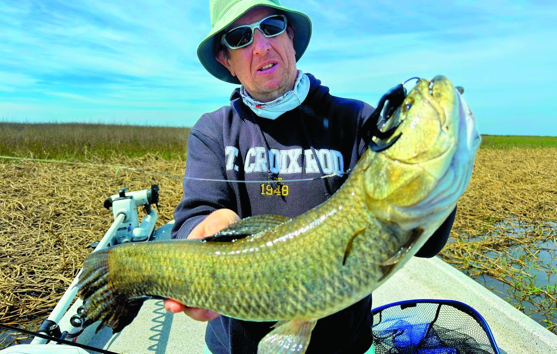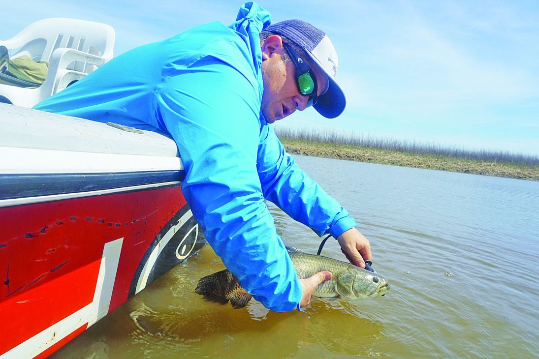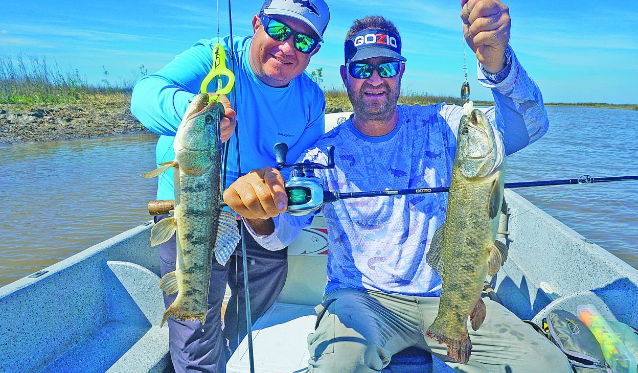 En la caminata Mariano probaba y pescaba, yo miraba a lo lejos. Me acerqué a la primera olla que se formaba detrás de un camino de tierra y, lanzando una rana de superficie Rubí, empecé a ver los primeros ataques, algunos fallidos y otros concretados. Al ver que podía tener un poco más de profundidad cambié por un Oreno de Alfer’s y les puedo asegurar que era tiro a tiro: un lanzamiento, dos manijazos y pique violento de una tarucha, muy divertido.