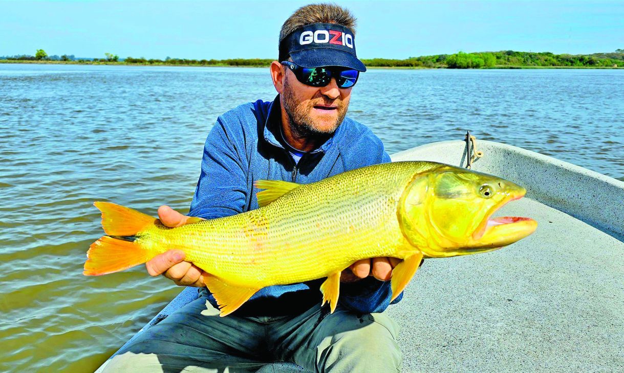 Siento una frenada del artificial, firme clavada y dorado saltando. Debería tener unos 3 kg, foto y al agua. Después de un ratito le tocó el turno a Mariano, se notaba que era bueno, lo peleó un ratito y se soltó, una pena. Seguimos bajando el río y nuevamente la suerte estuvo de mi lado: pique apenas cayó el señuelo, otra clavada certera y un doradazo de unos 5/6 kg dio el presente. Foto y al agua.