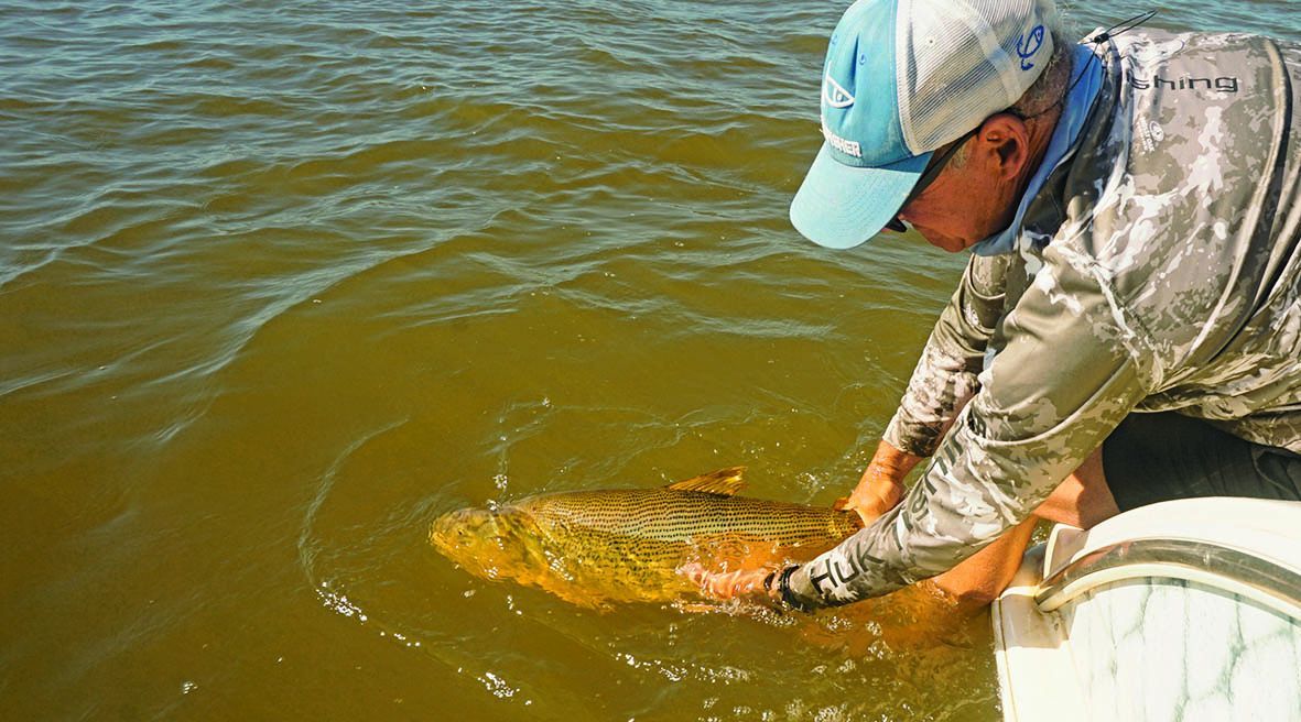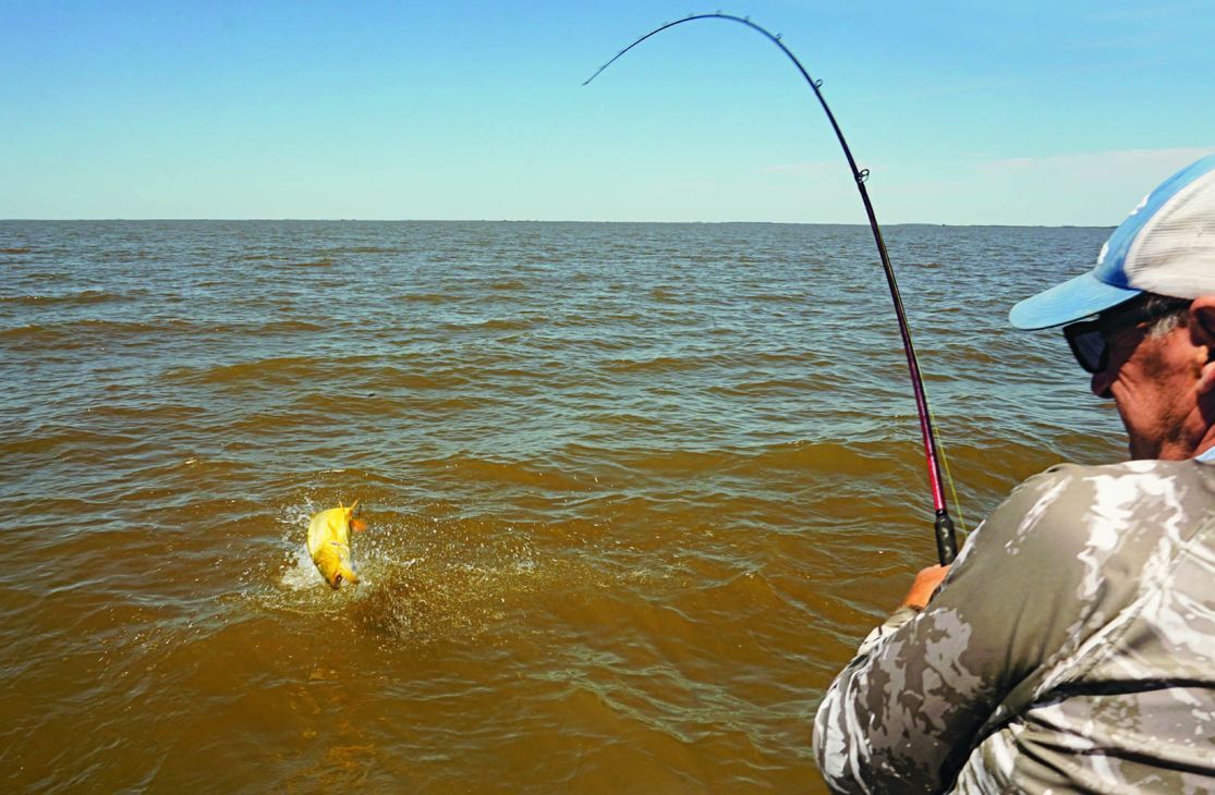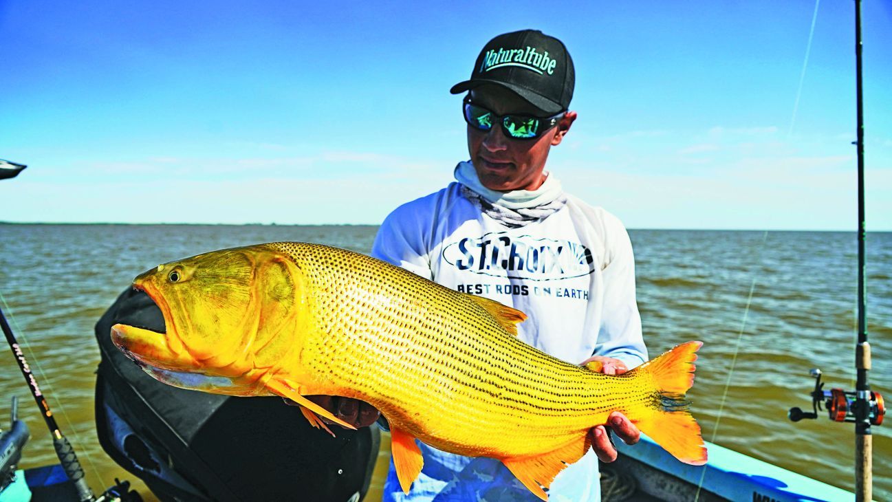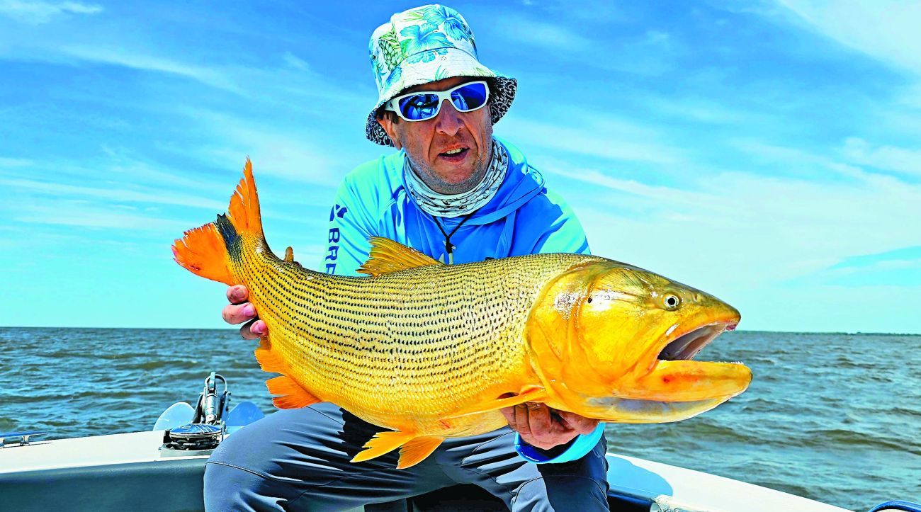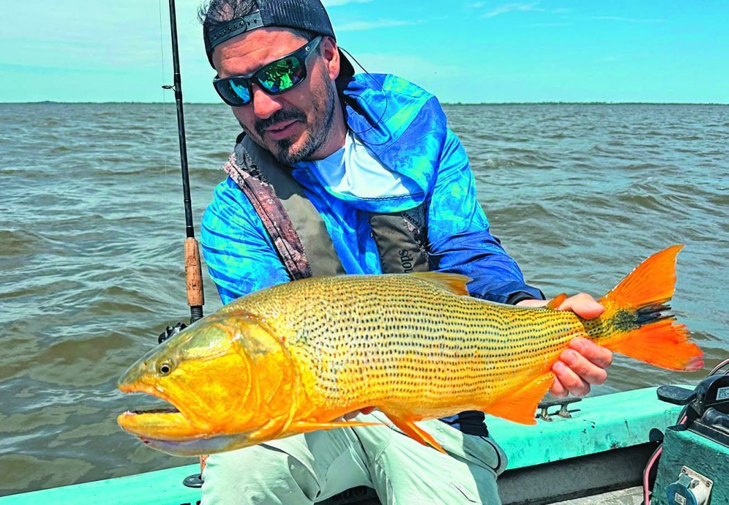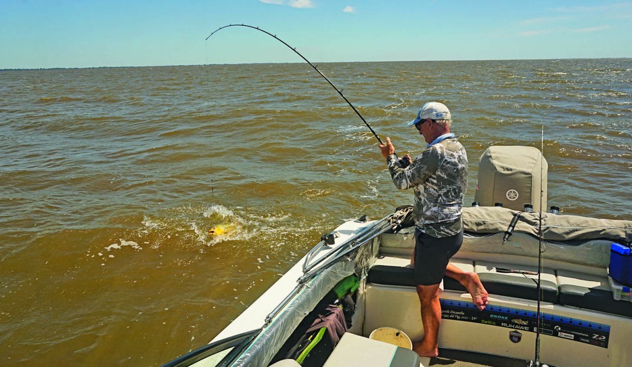 Como dijimos al principio, el viento se hacía sentir y la navegación se puso dura hasta el primer lugar elegido: una canaleta de unos 8 m de profundidad en la zona del Árbol Solo. Encarnamos las dos cañas, poniendo sábalo en una y bagre amarillo en otra. La pesca sería al garete, por lo cual arrojamos los aparejos, uno para cada lado, y regulando la salida del multifilamento dejamos alejar nuestras líneas. Al cabo de unos minutos, tremenda corrida en mi caña. Dejé comer, clavada certera y después de unos segundos vimos saltar un tremendo dorado que a la postre dio 6,700 kg. Corridas para acá, para allá, saltos y un pescado que no quería rendirse fácilmente, pero esta vez pude dominarlo. Fotos y al agua nuevamente. Ya estábamos recontentos, pero la fiesta recién comenzaba. Después fue el turno de Cachete, que metió tres o cuatro dorados seguidos, todos de muy buen porte. Siempre estuvimos comunicados con la otra embarcación, donde pescaban con señuelos sobre la costa. Maxi, con poppers, hacía de las suyas; Pablo, con sliders, probaba sobre los lugares bajos con mucho éxito y la jornada pintaba más que reconfortante.