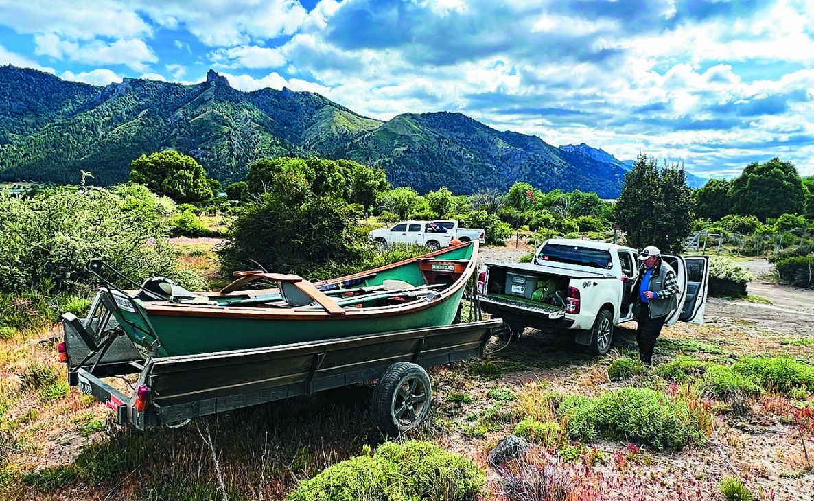 La idea original sería pescar el lago Filo Hua Hum desde el bote para acceder a los paredones de la costa norte. En este espejo no está permitida la navegación a motor, por lo que para surcar sus aguas se deben usar botes o balsas a remo o belly boats. Lo ideal es hacerlo en días no demasiado ventosos, pero a pesar de que llegamos temprano remolcando el dift boat (bote tipo McKenzie) de Nahuel, el dios Éolo tuvo otros planes para nosotros. Con el lago lleno de corderitos o más bien carneritos, resolvimos –a la fuerza– intentar la pesca de orilla y al vadeo. Para eso nos encaminamos al sector de la boca del río Filo Hua Hum en el lago homónimo y empezamos a prospectar las bahías aledañas tanto con líneas de flote como de hundimiento. Si bien no se notaba demasiada actividad en superficie, esa parte del lago estaba reparada del ventarrón y cada tanto subía alguna trucha.