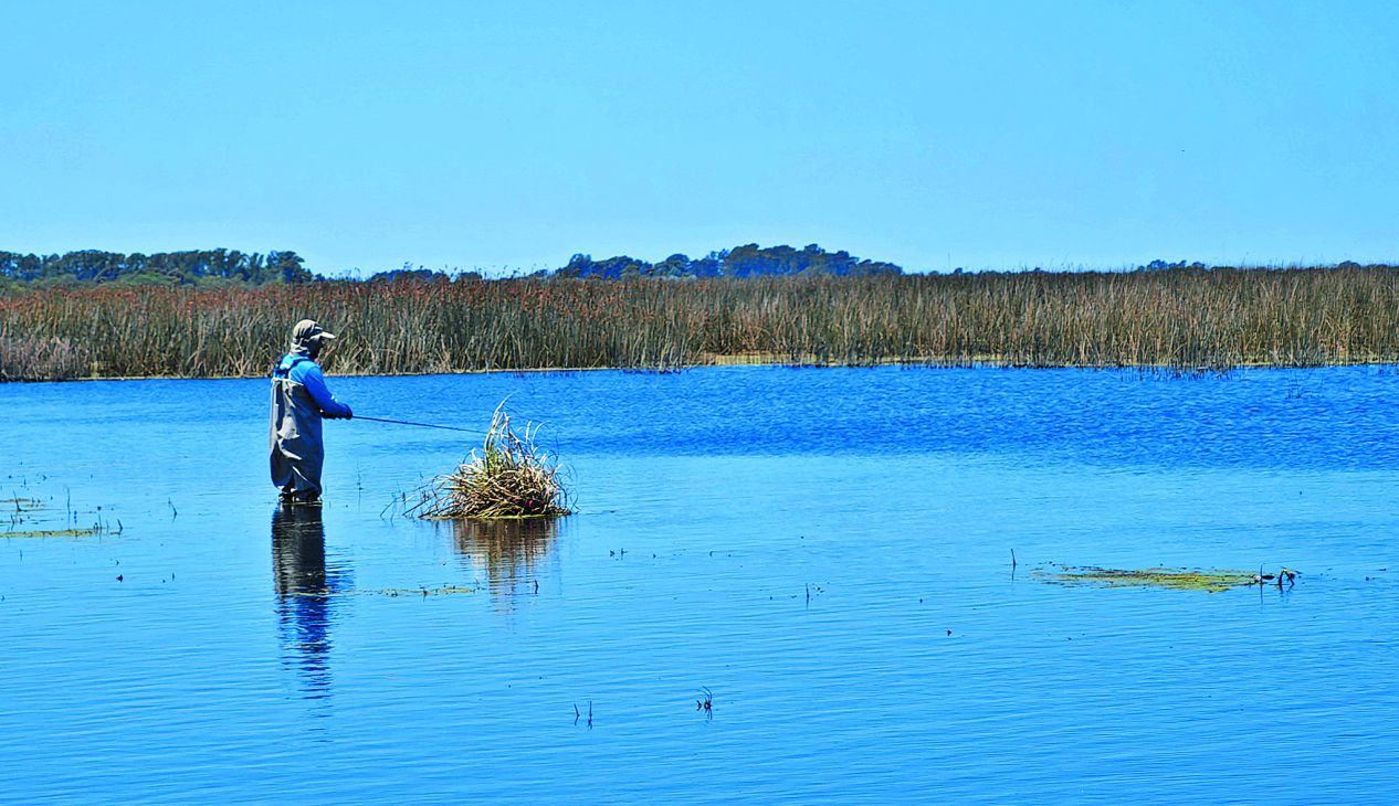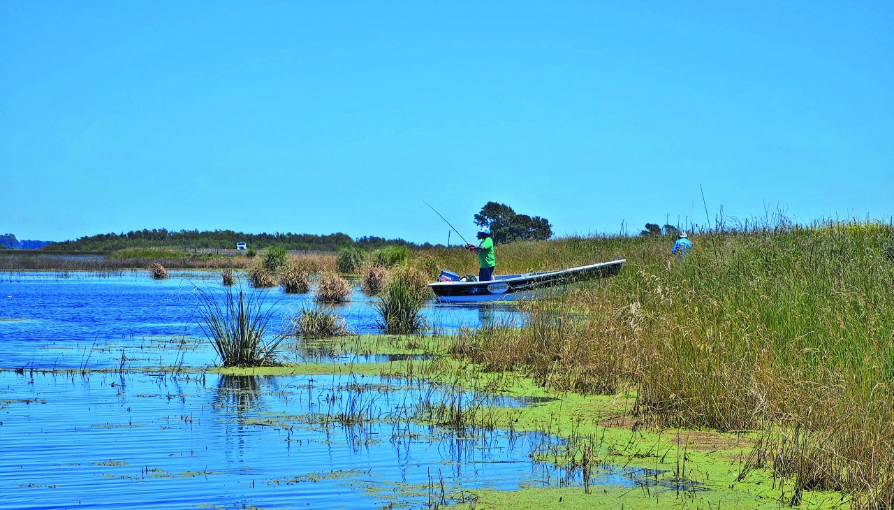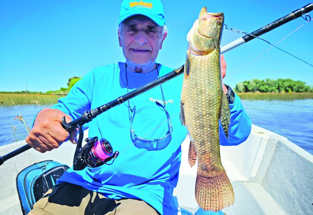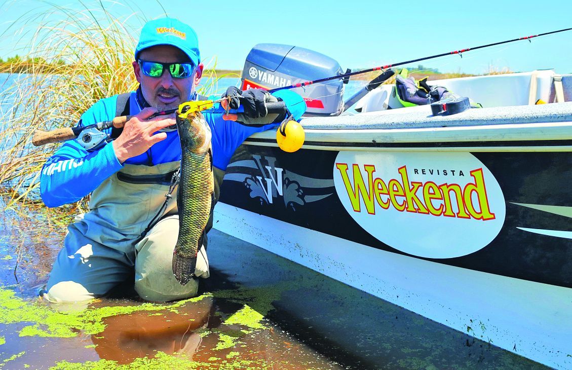 En Chascomús nos esperaba Fernando Nano Scardigno, guía local y amigo de la casa, que además estrenaba tracker de 5,10 m con motor de 25 HP. A las 8 ya estábamos en el predio cargando equipos y, minutos después, navegábamos hacia un sector rodeado de juncos, espadañas y fondo de 2 m promedio: el ámbito ideal para la especie. Los equipos fueron los clásicos: cañas de 2,10 a 2,40 m, 12 a 17 lb (1 lb = 0.453 kg); reeles 2500; multifilamento fino y boyas Plop con brazoladas largas, de hasta 1,80 m. La carnada rendidora, como siempre, fue la cola de dientudo o postas bien frescas.
