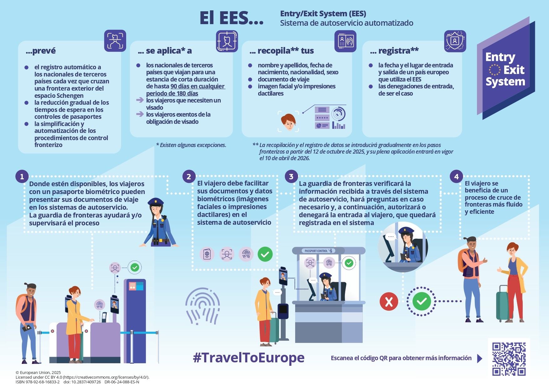 Un nuevo sistema recopila varios datos biométricos de los pasajeros se comenzará a implementar de manera escalonada en Europa a partir del 12 de octubre de 2025, de modo que sea más ágil el control de fronteras. Los pasajeros que viajen a países del Espacio Schengen (Alemania, Austria, Bélgica, Bulgaria, Croacia, República Checa, Dinamarca, Eslovaquia, Eslovenia, España, Estonia, Finlandia, Francia, Grecia, Hungría, Islandia, Italia, Letonia, Liechtenstein, Lituania, Luxemburgo, Malta, Noruega, Países Bajos, Polonia, Portugal, Rumanía, Suecia y Suiza). El Sistema de Entrada y Salida no significa que el viajero tenga que hacer ningún trámite adicional de manera previa, ya que se trata de un procedimiento que se hace en la frontera que y estará totalmente implantado para el 9 de abril de 2026. La puesta en marcha de este sistema es independiente de la entrada en vigor del ETIAS, que está previsto para el último trimestre de 2026 y tiene como nombre de Sistema de Entrada y Salida.