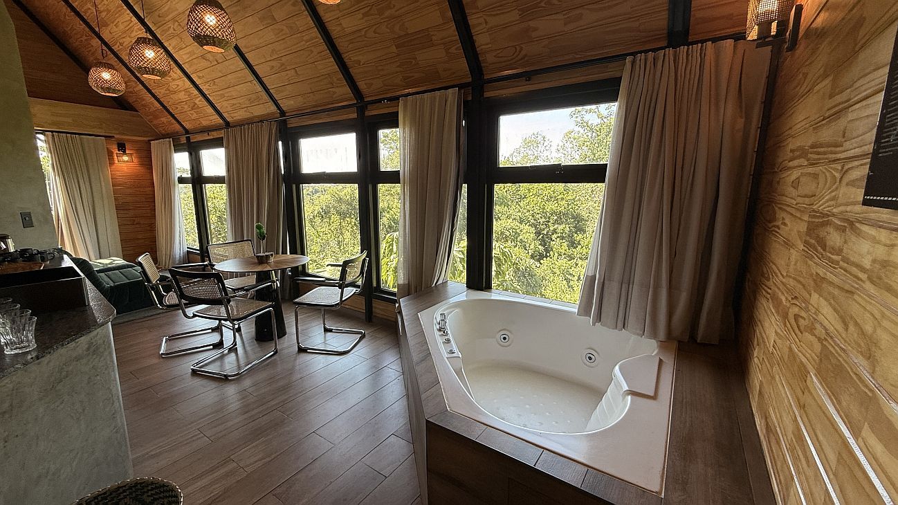 Desarrollado a la medida del espacio en el que se lo ubicó, cerca del hito Tres Fronteras, en donde antiguamente funcionó un parque de actividades, este hotel boutique tiene espacio con nombres tan particulares como Birdhouses (elevadas por encima de las copas, con decks y piscinas privadas), Tiny Houses y Treehouses (al nivel de los troncos), que ofrecen diferentes amplitudes de espacio pero todas con un confort rayano con el lujo. Algunas son de tres plantas: en el primera el living, en la segunda el dormitorio y en la tercera, por encima de la vegetación, con una piscina infinita que permite dominar el paisaje.