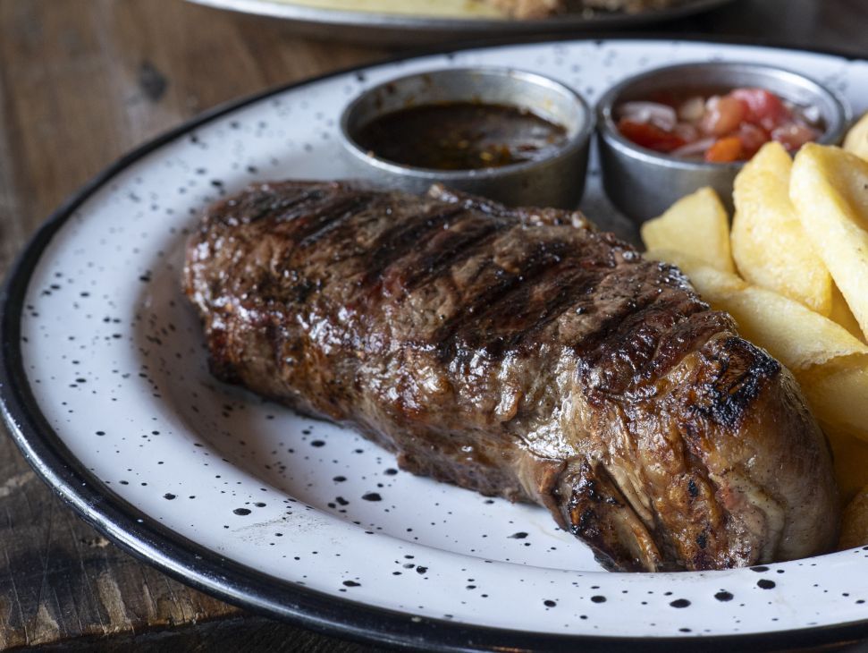 - Bife de chorizo en La Boquería: es un bodegón que brilla por su propuesta de platitos ibéricos y cortes a la parrilla, combinando tradición y sabor en un ambiente relajado. Entre sus imperdibles se encuentra el bife de chorizo de 400 g, un corte generoso, jugoso y con una capa de grasa externa que potencia su sabor al asarse, logrando una carne tierna por dentro y dorada por fuera. Para acompañarlo, nada mejor que sus irresistibles papas fritas estilo bastón, crocantes y doradas, que además pueden pedirse con un extra de provenzal para sumar aroma y sabor. Dirección: Soler 5101, CABA.