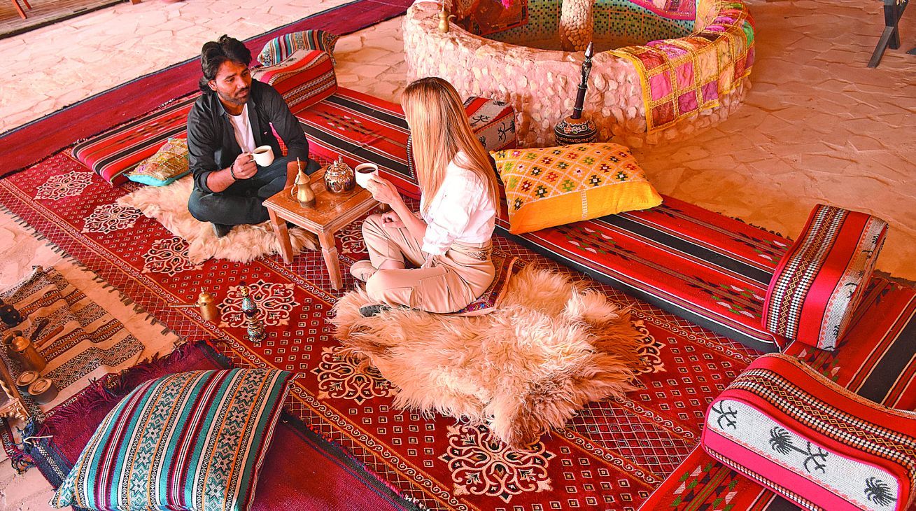 Antes de llegar a Petra nos desviamos de la ruta por un sendero de tierra roja rumbo al Wassaif Camp: dormiremos en el desierto, en medio de la nada, en una tienda de paredes de tela de chivo y algodón con forma de cabaña, como las han usado los nómadas aquí por milenios. Mohamed Hasanat -dueño del complejo- nos recibe con hospitalidad beduina, la misma de sus antepasados: “Mis padres y todo mi linaje familiar vivieron en tiendas de este material”. Hoy las han acondicionado con baño individual, agua caliente, aire acondicionado y camas dobles. En la primera noche nos sirven un zarb: cordero cocinado bajo la arena durante 4 horas con arroz, que tiene un sabor ahumado.