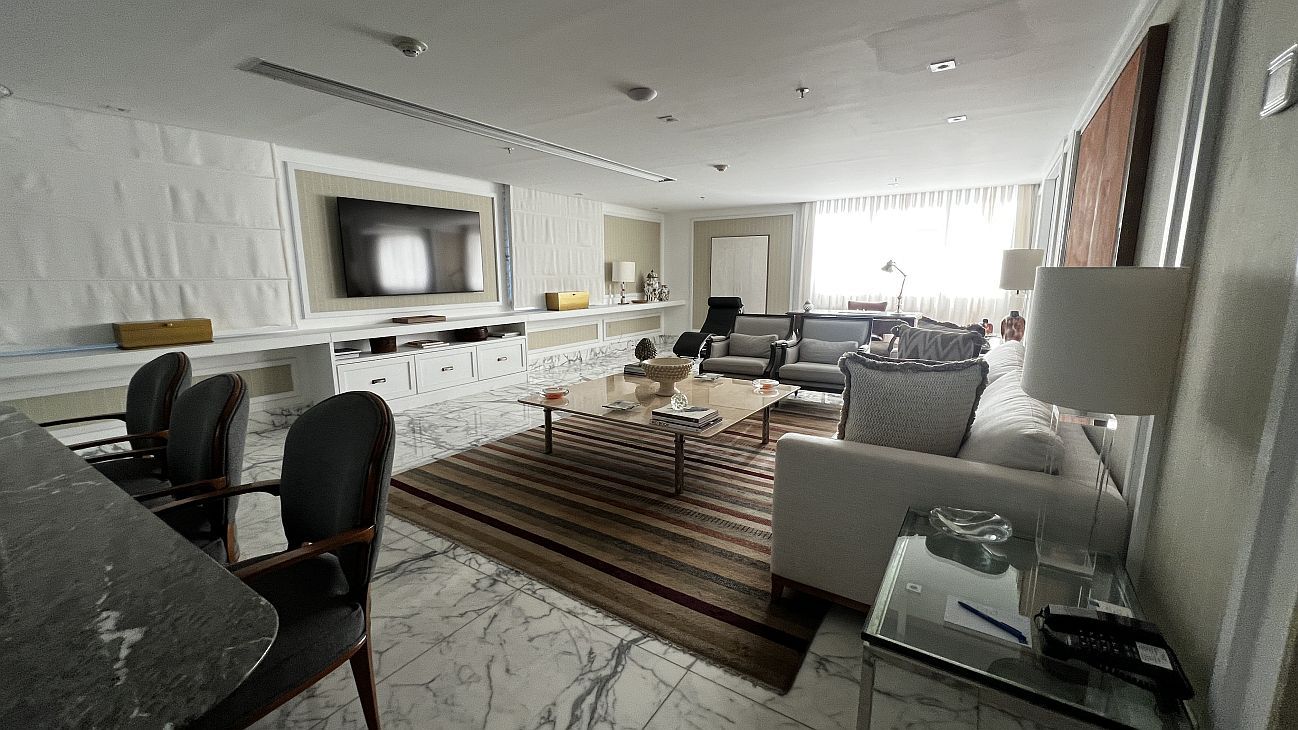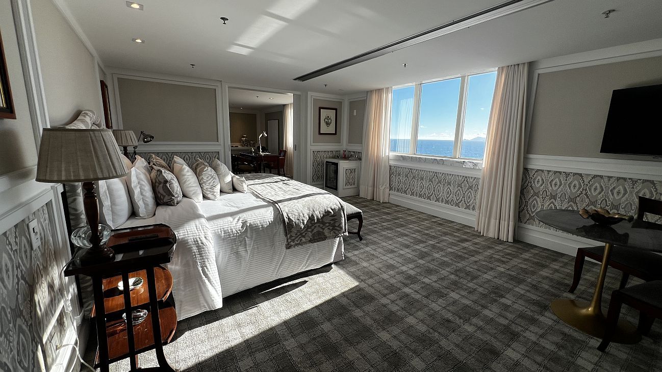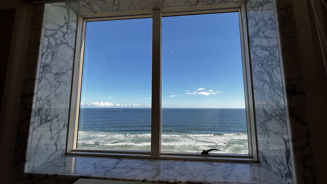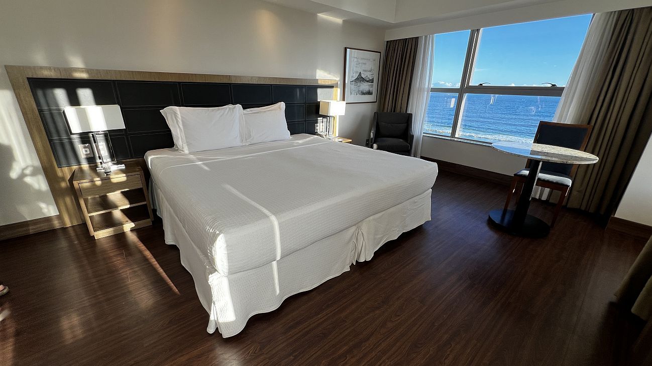 Los cuartos de la torre más antigua, la que está frente a la playa, son muy amplios, con grandes placares y baño, dos escritorios, uno junto a la venta y el otro a continuación del frigobar. Mullidas batas, pantuflas y hasta tabla de planchar. Suficiente para dormir con sus seis almohadas de diferente densidad y prepararse para la jornada. El sitio del desayuno, como buen hotel brasileño, es enorme y está lleno de argentinos. Allí hay variedad de cosas dulces y saladas para comer, que rotaron cada día, incluso con una estación de platos preparados en el momento como omelette.